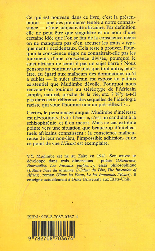 Ce qui distingue ce livre, c’est sa présentation — l’une des premières, à notre connaissance — d’une subjectivité africaine. Par nature singulière, cette subjectivité est souvent accusée, au nom d’une certaine idée préconçue de la « conscience noire », d’adopter des traits « typiquement » occidentaux. Cette accusation reste pourtant à démontrer. Pourquoi la conscience africaine ne pourrait-elle pas traverser les mêmes tourments d’une conscience divisée ? Pourquoi le sujet africain ne serait-il pas, lui aussi, un sujet barré ? Nous soutenons au contraire que, plus que tout autre, peut-être en raison des souffrances liées aux dominations qu’il a subies, le sujet africain est particulièrement exposé au pathos existentiel que Mudimbe révèle. Pourquoi nous renvoie-t-on systématiquement à l’image stéréotypée d’un Africain simple, naturel, proche de la vie ? N’y a-t-il pas là les séquelles d’une idéologie raciste qui cantonne l’homme noir au stade préréflexif ? Il est vrai que le personnage central chez Mudimbe est névrotique, qu’il vit « l’écart », qu’il est un candidat à la schizophrénie, et qu’il en meurt. Mais cet exemple extrême illustre une réalité partagée par beaucoup d’intellectuels africains : la conscience douloureuse de leur non-appartenance, l’impossible adhésion à un lieu ou à une identité, faisant de L’Écart une œuvre exemplaire à cet égard.